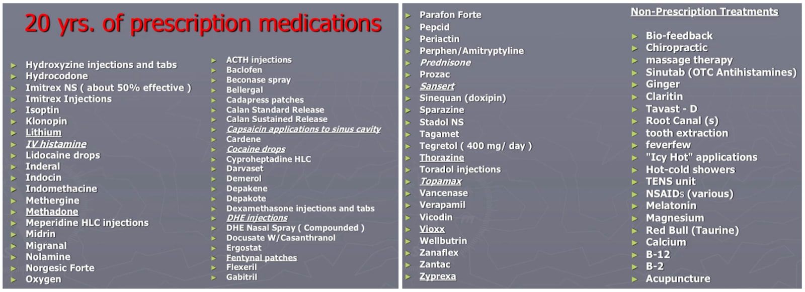 “I’ve seen him walk down the hallway (holding onto the wall for dear life) with his head cocked to one side and walking like a 100-year old man. I’ve seen him cry, pull out his hair, and beg me to take him to the emergency room. On one occasion, I was driving to the hospital—in the middle of the night—with 2 daughters in the back seat and he’s practically pushing the dash of the car through the windshield because I’m not driving fast enough—and he’s crying all the way. I know that he will do ANYTHING—ANYTHING to get rid of this pain. I can’t believe that most doctors don’t realize this—maybe they’d like to spend a couple of nights at my house and see what he goes through !!! When he’s having the series of headaches he won’t sleep because he knows that he will wake with another one—what a terrible, scary feeling! Thank God I don’t suffer from these headaches—but I feel so helpless when it comes to comforting him. After a while it starts taking its toll on me and our children. I dred for the night to come—since that’s when most of his headaches recur and we start all over again!”