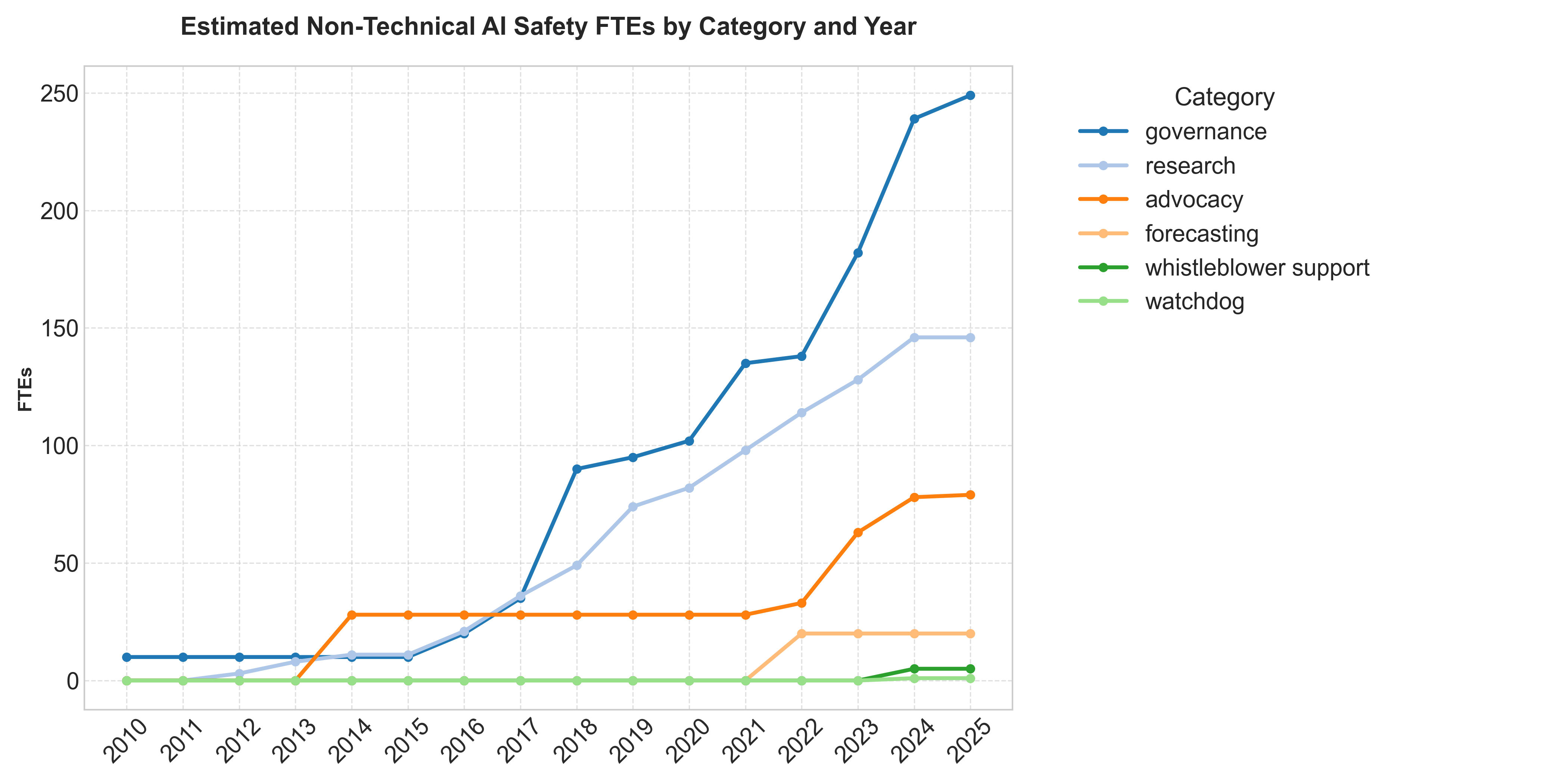 I also created graphs showing the number of non-technical AI safety organizations and FTEs by category.