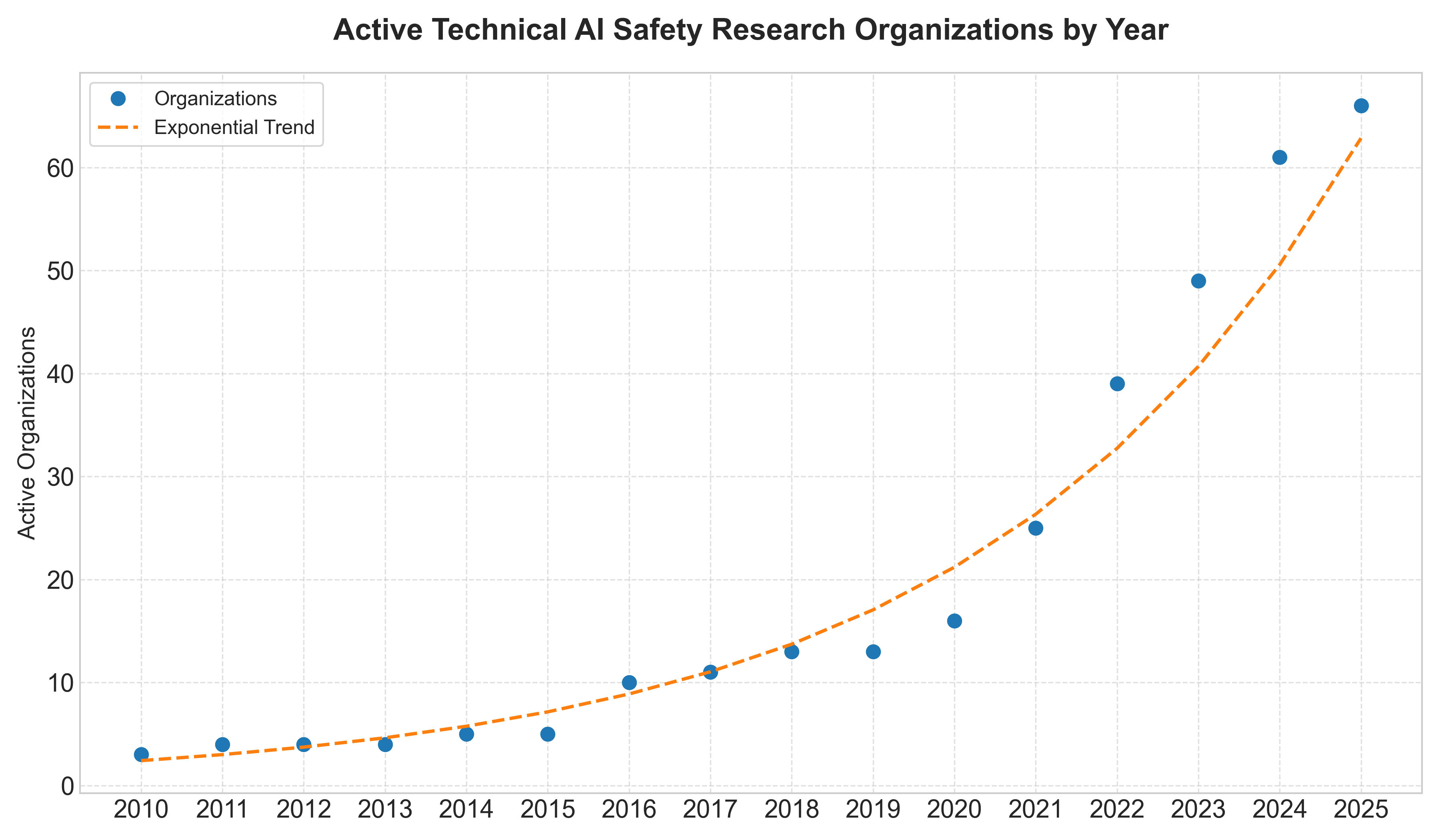 The exponential models describe a 24% annual growth rate in the number of technical AI safety organizations and a 21% growth rate in the number of technical AI safety FTEs.