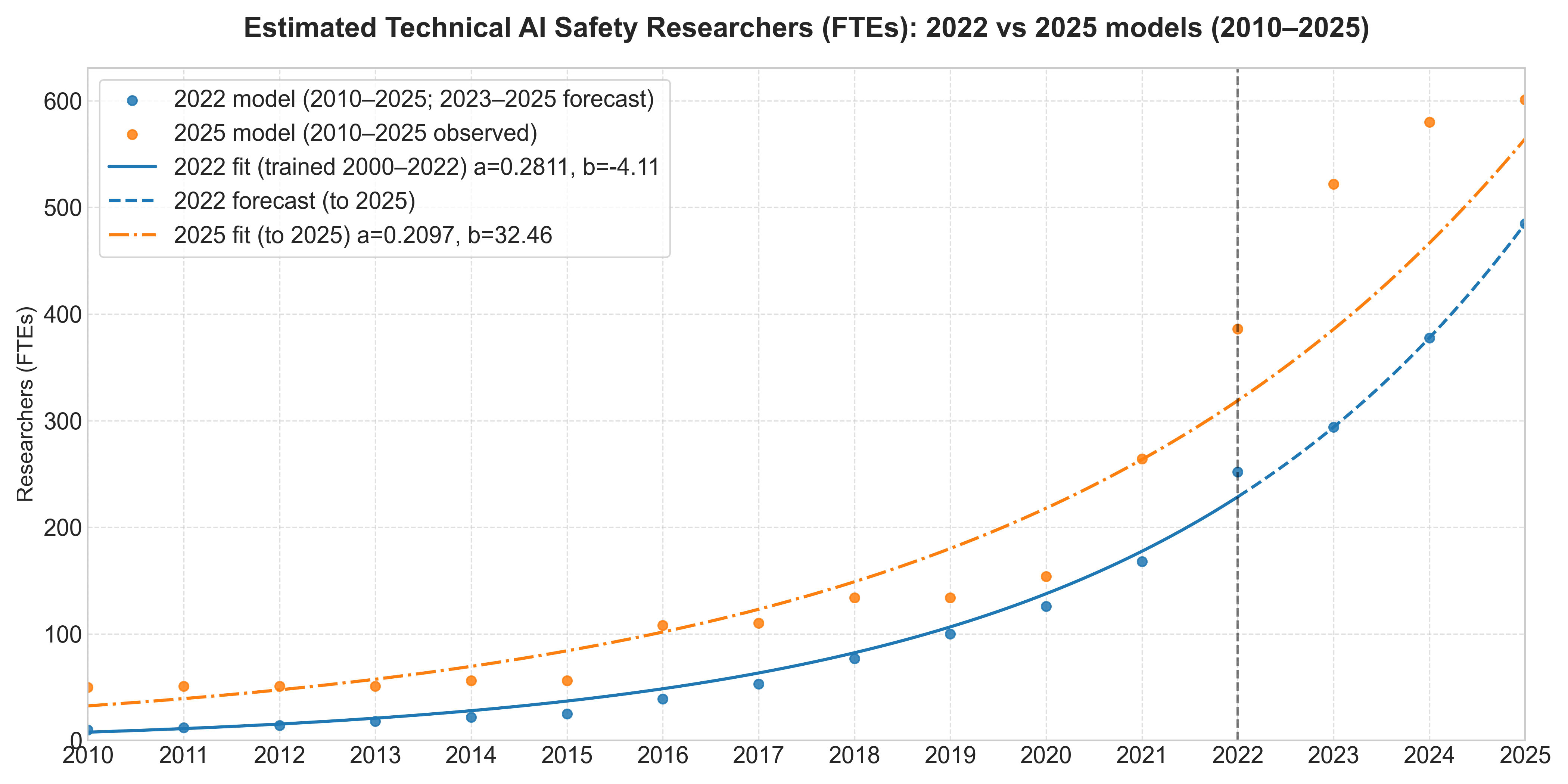 The following graph shows the difference between the old dataset and model from the Estimating the Current and Future Number of AI Safety Researchers (2022) post compared with the updated dataset and model.