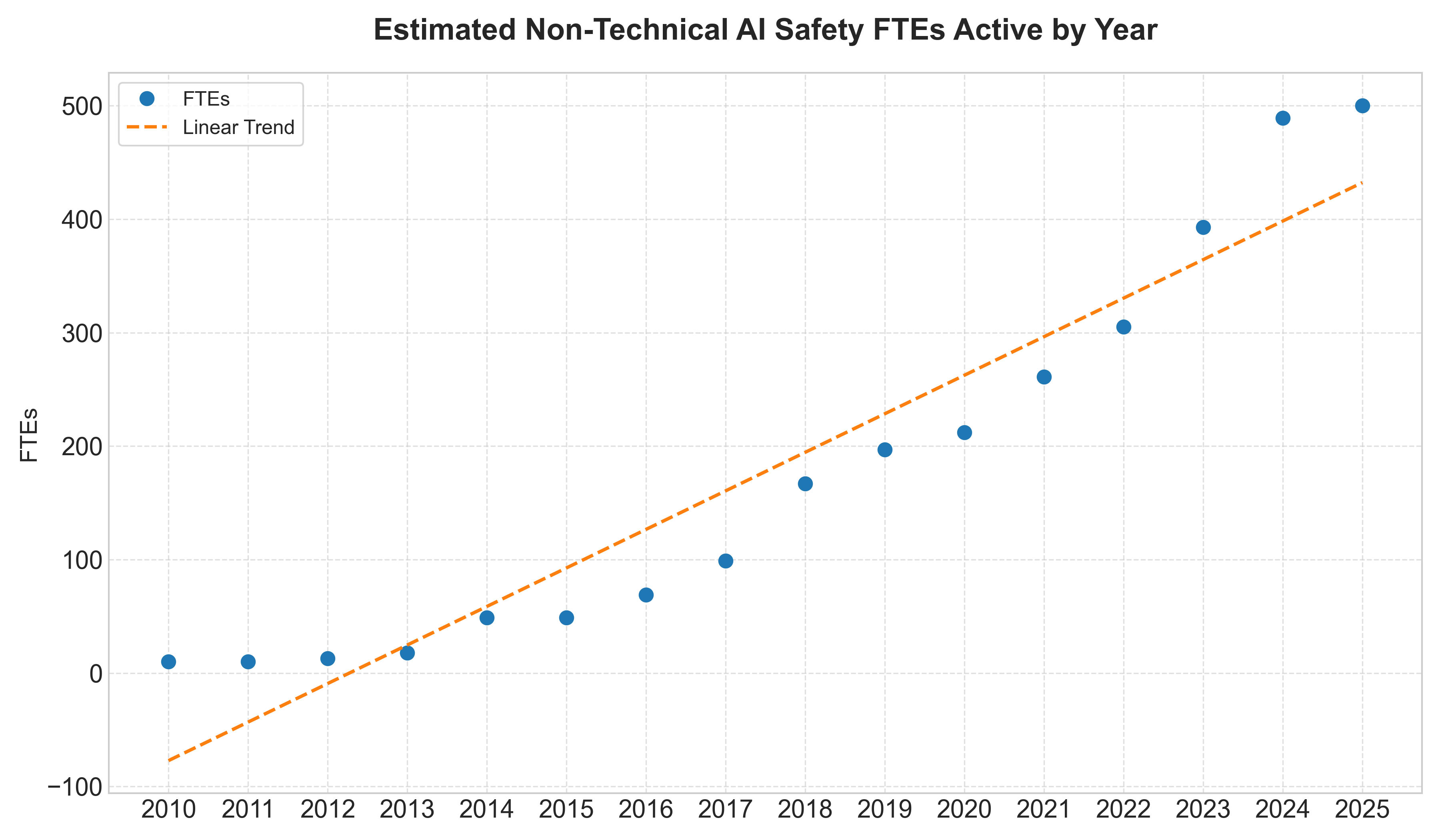 I also applied the same analysis to a dataset of non-technical AI safety organizations. The non-technical AI safety landscape, which includes fields like AI policy, governance, and advocacy, has also expanded significantly. The non-technical AI safety dataset contains 49 organizations working on non-technical AI safety and a total of 500 FTEs working at them.