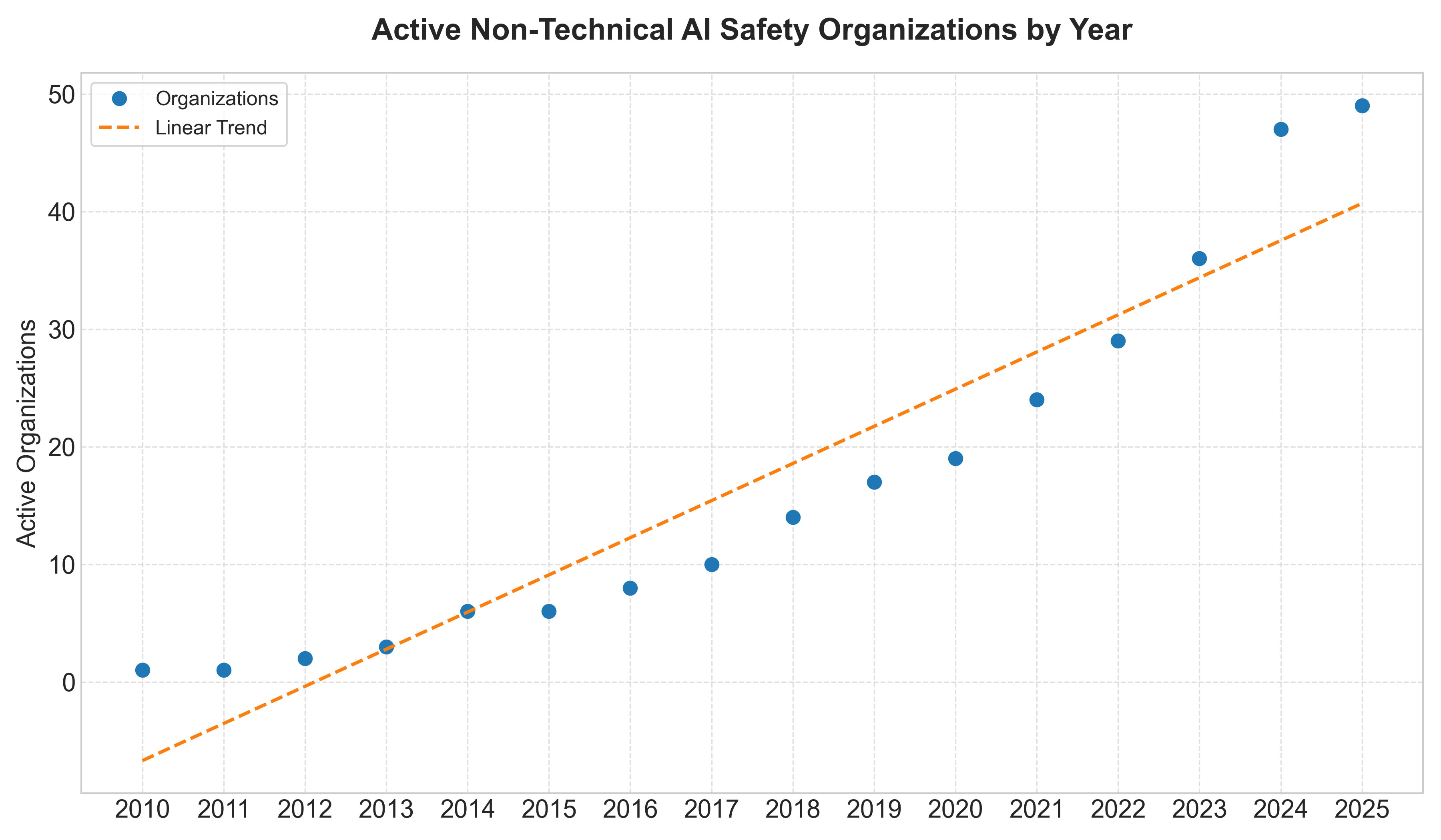 The graphs plotting the growth of the non-technical AI safety field show an acceleration in the rate of growth around 2023 though a linear model fits the data well from the years 2010 − 2025.