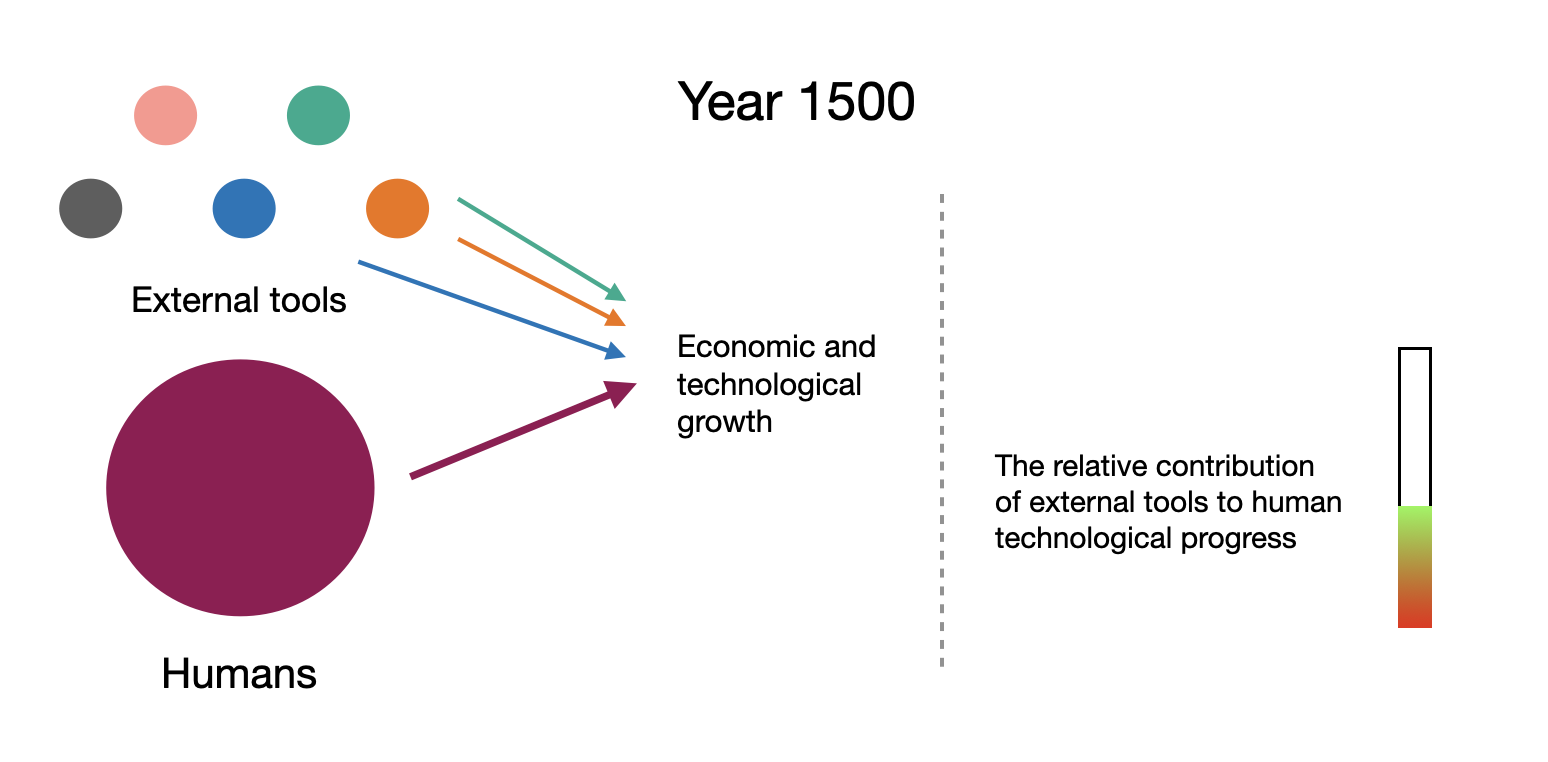 In 1950, we see a continuation of the preceding trend: our set of external tools has been expanded further, and has become an even greater factor in economic and technological growth. Unlike in 1500, humanity has now made inventions such as computers, telephones, and combustion engines, which in turn unlock new avenues of innovation.