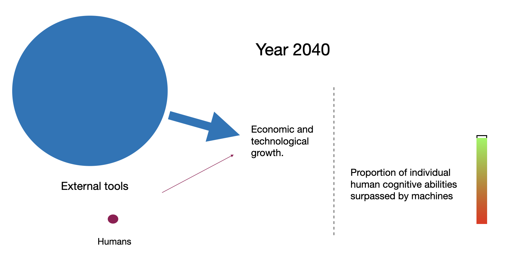 In 2040 (or within a few decades from now; the exact year is not important), Model 1 predicts that virtually all human cognitive abilities have been surpassed by AI systems. Importantly, and most distinctively, Model 1 predicts that once AI systems surpass humans on a sufficient set of cognitive abilities, human cognitive abilities will no longer be the main limiting factor to technological progress. The limiting factor will then be the AI systems themselves, which are continually growing themselves in ever more competent ways, in effect doubling the economy on a timescale of months or weeks, if not faster. The picture we started with has thus been reversed, and humans, if they are around anymore, are now but a tiny speck compared to the mushrooming Jupiter of AI.
