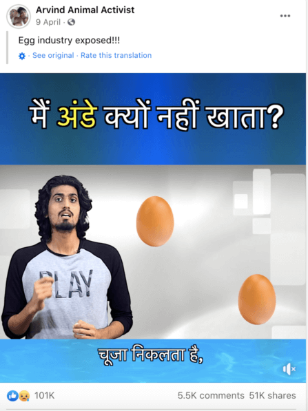 Arvind Kannan and his partner have been producing educational videos about veganism and promoting them through Facebook, YouTube, and Instagram using the social media handle “Arvind Animal Activist.” Their videos cover the ethical, health, and environmental reasons for going vegan and are primarily targeted at Indian audiences that speak Tamil and English. Since receiving a grant, some of their highest-performing videos have garnered over a million views, including an explanation of the egg industry. Arvind has also learned Hindi well enough to create social media content, and he reports that their Facebook page has seen dramatic growth, with around 25,000 new followers in the span of a few months. Arvind and his partner are working hard to create more content that will be both effective and relatable for the local population. They have plans to produce videos in French, which would expand their reach even further.