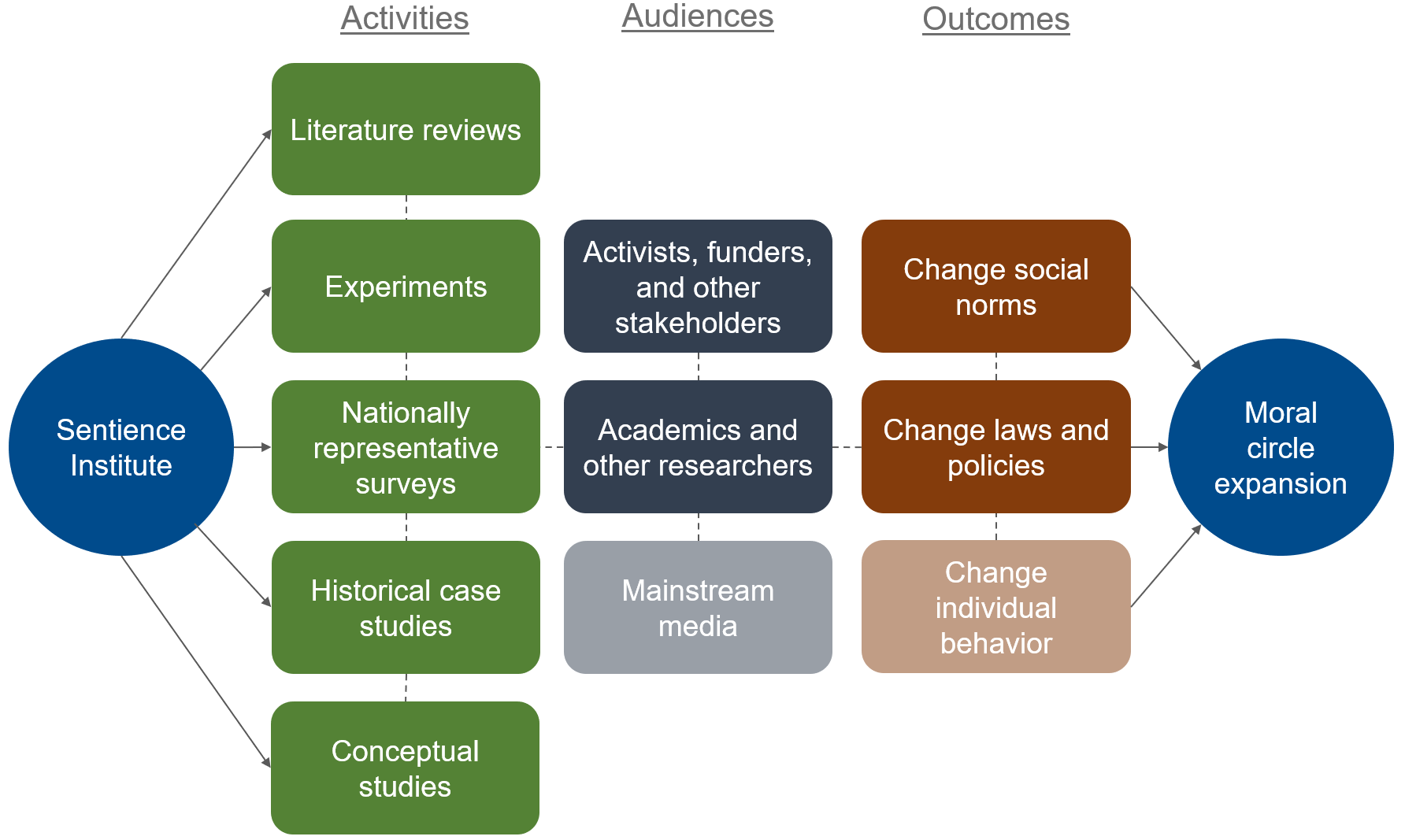 We updated the Our Perspective page on our website with more detail on our approach of effective altruism and longtermism, the reasons we prioritize moral circle expansion, and our theory of change, which is shown below.