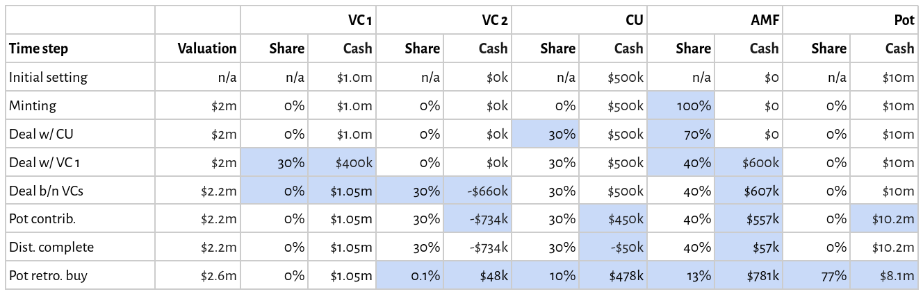 It took us a while to come up with a scenario that “works,” in the sense that in particular the VCs make a profit (or else they wouldn’t invest) without making the pot or the fraction that it invests unrealistically big or its bid unrealistically high. This indicates that the parameters of the pot budget will need a lot of tuning and that issuers and investors will be well-advised to carefully think through their funding scenarios to make sure that they’re realistic.
