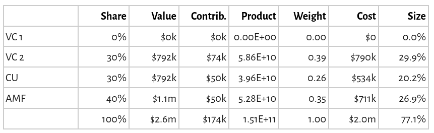 Next, all three certificate shareholders contribute to the pot. AMF and CU add an arbitrary $50k to the pot whereas VC 2 tries hard to maximize the weight it’ll have when the pot buys the certificate from them again, but without selling more of the certificate than it owns. The prices in the ratchet auction can only go up, so even if it could borrow certificate shares from (say) AMF, that would not be profitable.
