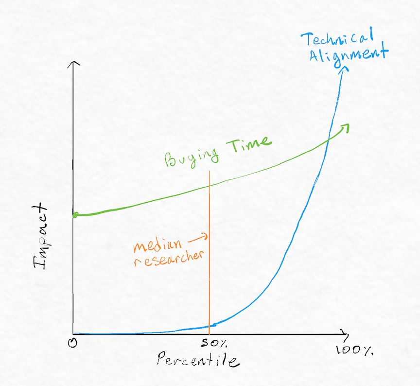 Alignment research seems heavy-tailed. It’s often easy to identify whether or not someone has a reasonable chance of being at the tail (e.g., after 6-12 months of trying to solve alignment). People who are somewhat likely to be at the tail should keep doing alignment research; other people should buy time.