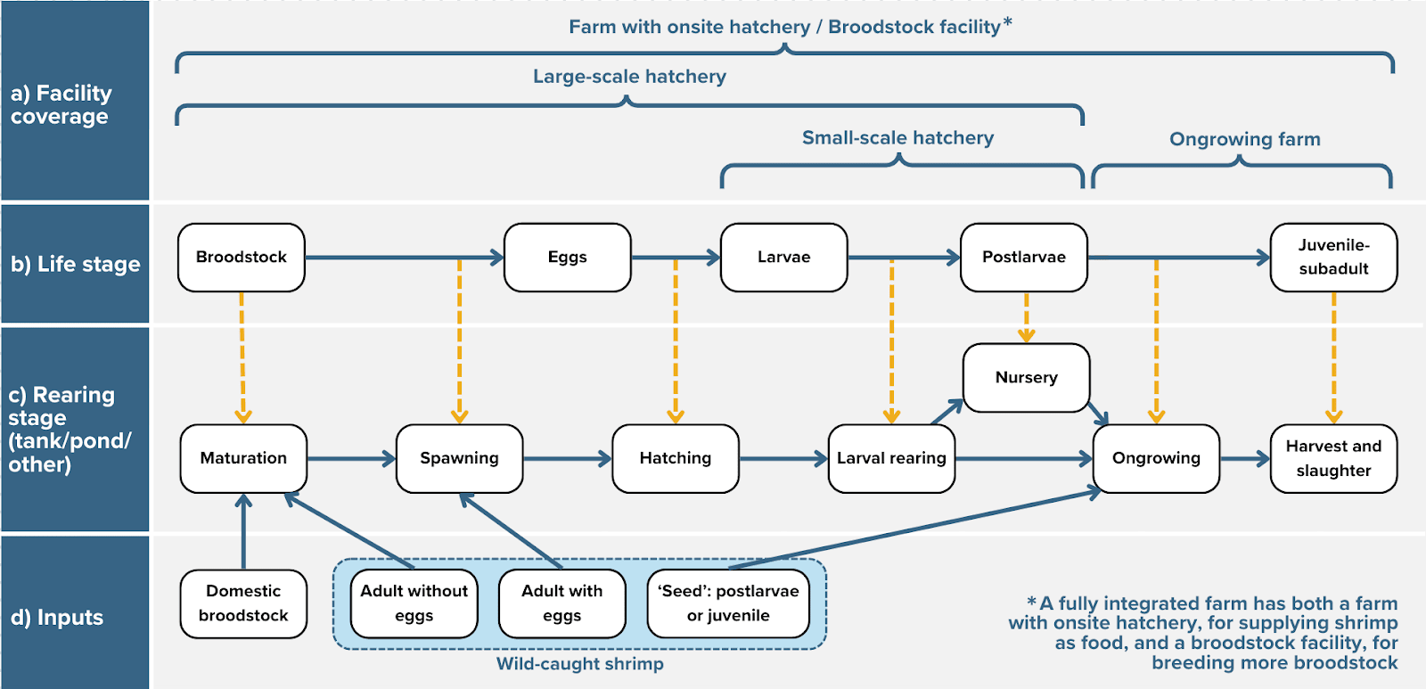 Figure 4: Conceptual diagram of a) the shrimp farming process different facilities cover; (b) the life stages of farmed shrimp; (c) the associated rearing stages of the farming process and (d) the inputs of different types of shrimp into the shrimp farming systems. Dashed yellow lines represent when shrimp at different life stages are moved to different rearing stages. Based on FAO (2009a; 2009b; 2023c).