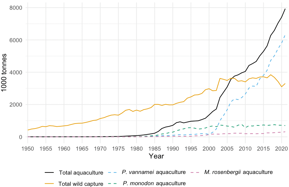 Figure 2: Tonnes of shrimp produced globally from 1950 to 2021 from aquaculture (black) and wild capture (orange), along with contributions to aquaculture tonnage by P. vannamei (dashed blue), P. monodon (dashed green), and M. rosenbergii (dashed pink). Based on FAO (2023a; b).