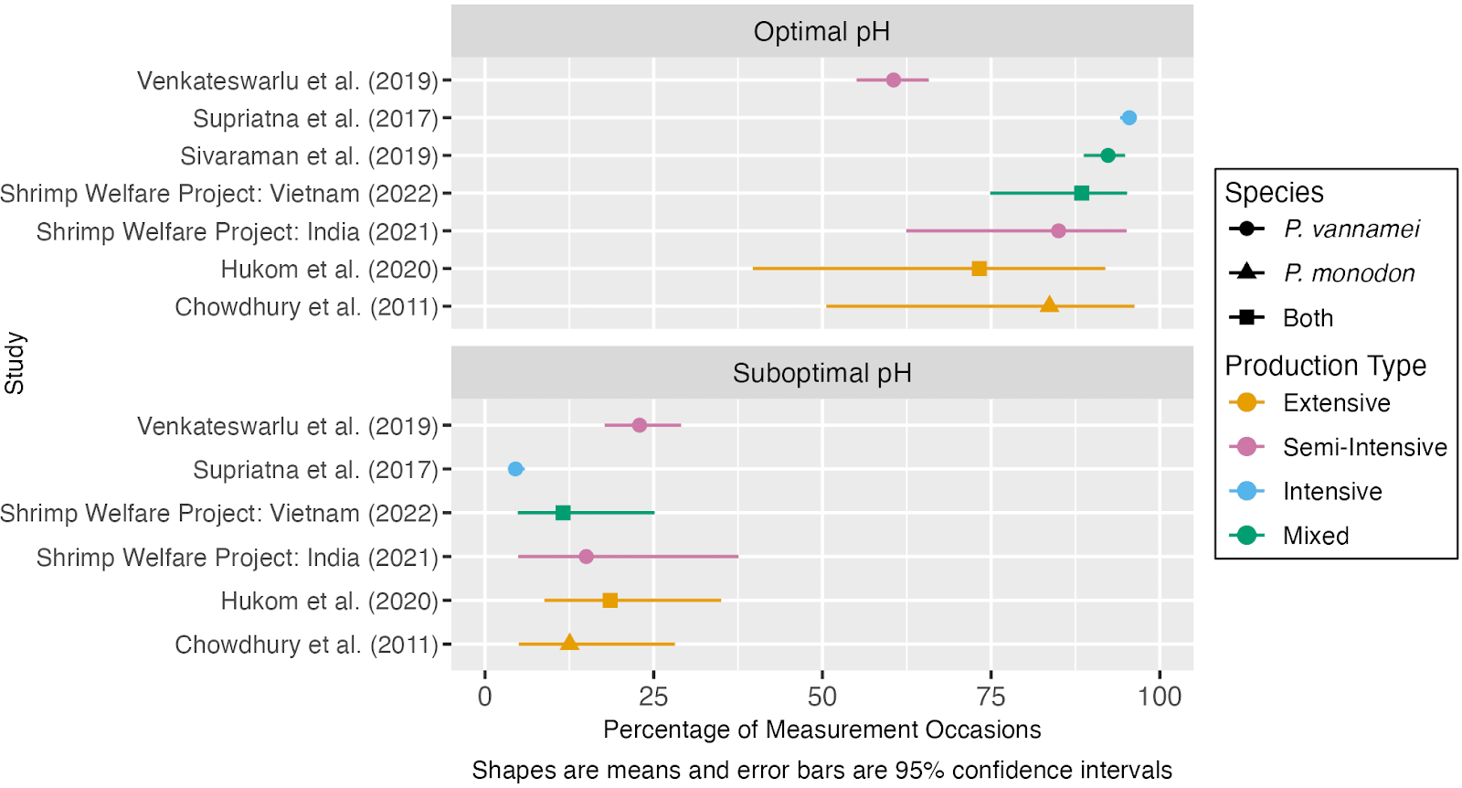 We extracted data from surveys to estimate the extent to which farms maintain water quality within the recommended ranges. For each study, we estimated the average percentage of the time that water quality is “optimal” (i.e., no negative welfare effects) and “suboptimal” (i.e., negative welfare effects that are either sublethal only or cause lethality at rates that are typical in natural conditions), from which we can also infer how often it is unacceptably low. The complete analysis, including a discussion of the limitations of available data, is available in our supplementary document, Water Quality in Shrimp Ongrowing Ponds; the results are summarized in figures in the subsections below.