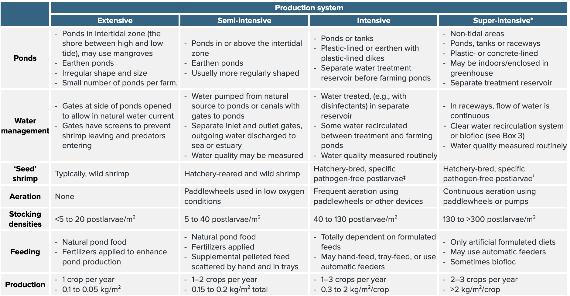 Ongrowing facilities are typically characterized as extensive, semi-intensive, intensive, or super-intensive, depending on their yield potential per unit area per time period. The FAO notes that these categories do not describe the actual diversity in operating practices implemented in different locations (Barg et al., 1999). That said, there are clusters of practices and conditions that roughly align with how intensively managed a farm is, which we list in Table 1 below. Note that any numerical estimate is relative to time and place, so our numerical ranges reflect our best understanding of contemporary differences in countries with the greatest amount of shrimp production.