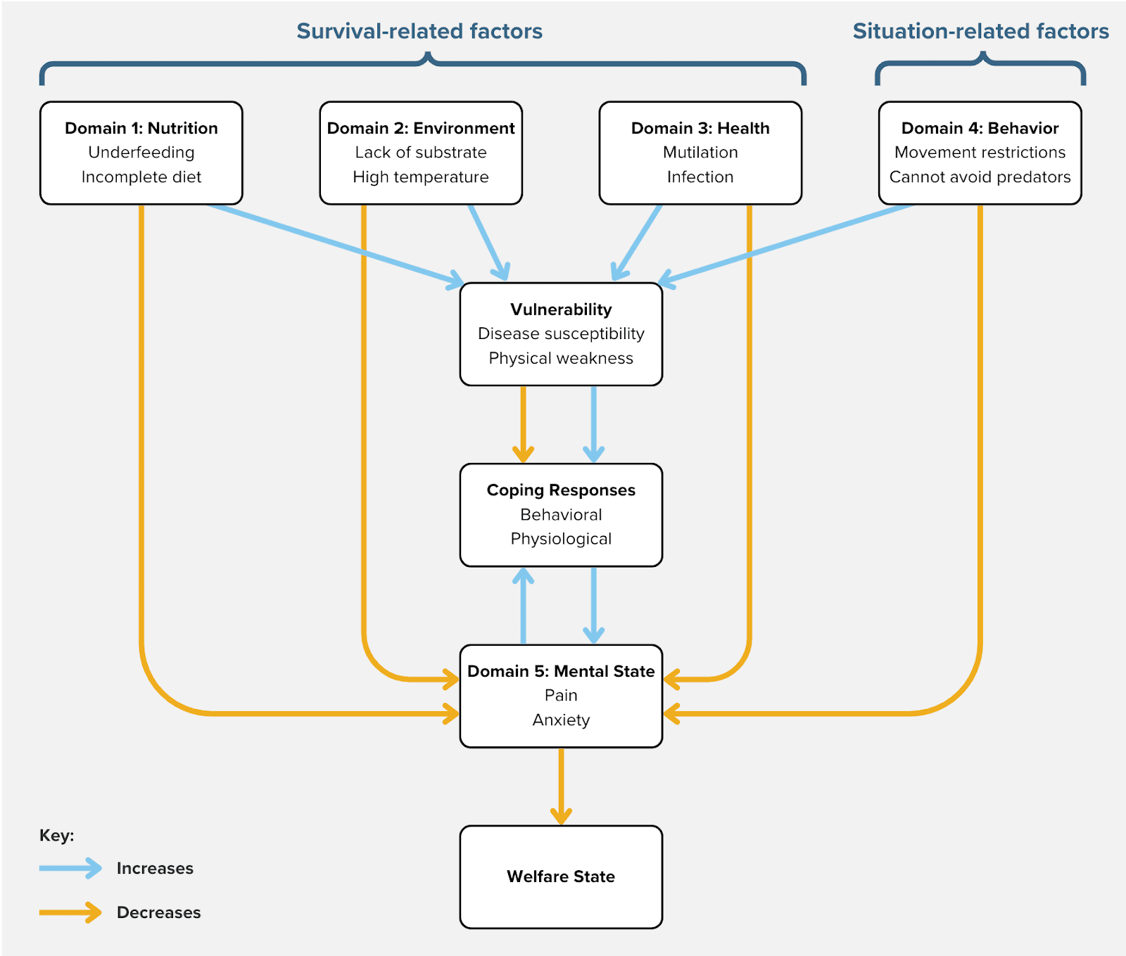 We embrace an affect-based definition of welfare that identifies an animal’s welfare with the valence, duration, and intensity of its experiences. To identify proxies for valenced experience, we adopt the Five Domains framework (Mellor et al., 2020; see Figure 1), which was originally applied to terrestrial vertebrates but has recently been extended to aquatic invertebrates (Pedrazzani et al., 2023; Perkins, 2021). Domain 1 is Nutrition (e.g., restricted feed intake reduces welfare, a balanced diet increases it), Domain 2 is Environment (e.g., overcrowding reduces welfare, a clean space increases it), Domain 3 is Health (e.g., mutilations reduce welfare, high immune capacity increases it), and Domain 4 is Behavior (e.g., a barren environment reduces welfare, an absence of predators increases it). The first four domains do not themselves reflect good or bad welfare, but instead influence welfare via Domain 5, Mental State (e.g., pain is a manifestation of negative welfare, comfort is a positive welfare state; Mellor & Beausoleil, 2015, p. 242).