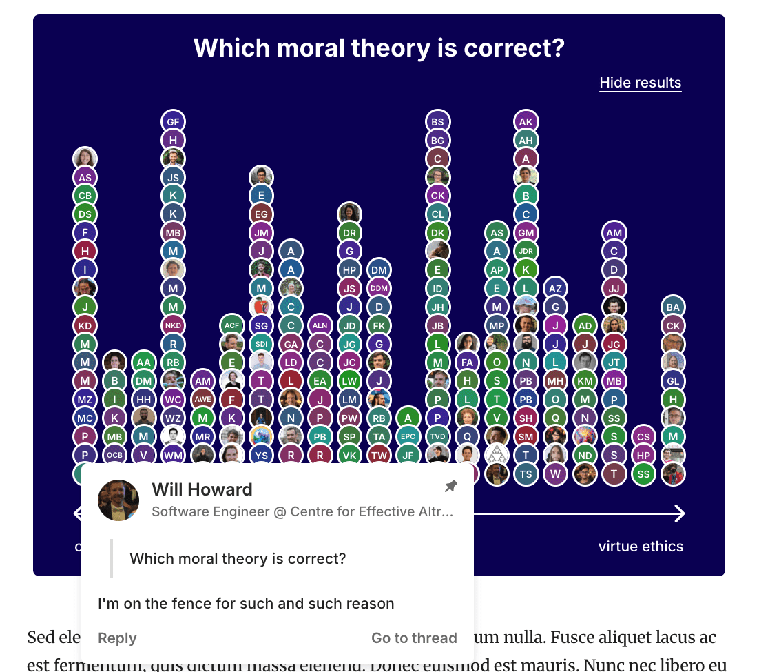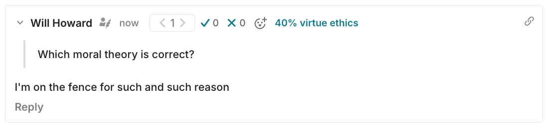 So that readers can contextualise your comment, a percentage will appear on the comment to indicate the strength of your vote, and whether you have changed your mind since your first vote. To avoid confusion on posts with multiple polls, the title of the poll will be quoted at the top of your comment.