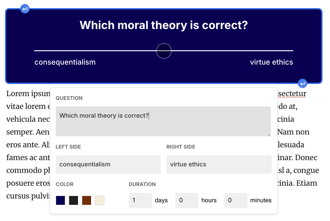 It’ll look like the polls we’ve had for other debate weeks – it’ll be one axis, with a custom title, and custom labels on each end. You can use the poll to: