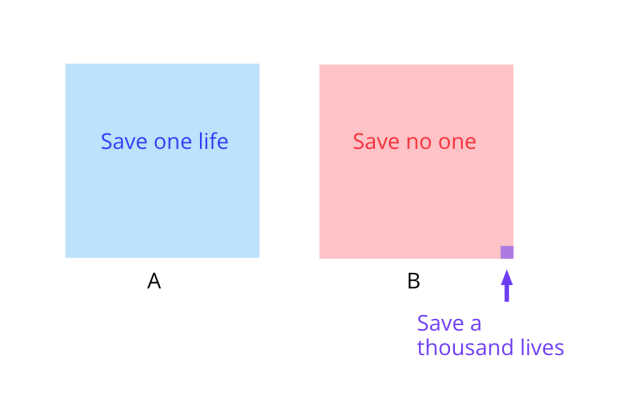 Thus, suppose you can save A one life for certain, or (B) a thousand lives with 1% chance. And suppose you value each life equally, such that saving a thousand lives is a thousand times better than saving one. EUM then says to choose B, because it saves ten lives in expectation, whereas A saves only one.