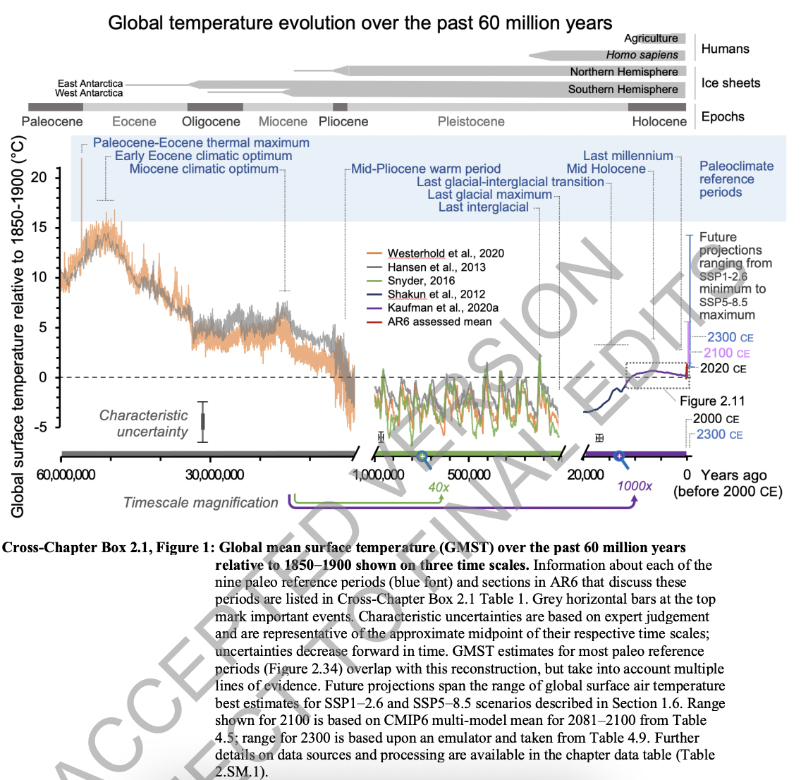 “A major new compilation of proxy temperature data (Hollis et al., 2019) analysed using multiple statistical approaches (Inglis et al., 2020) indicates that GMST was 10°C–25°C (90% range) warmer than 1850–1900, or about 5°C warmer relative to the pre-PETM state. A related synthesis study also estimates that PETM warmed by 5°C (no uncertainty assigned; Zhu et al., 2019). A recent benthic isotope compilation (Westerhold et al., 2020) transformed to GMST based on the formulation by Hansen et al. (2013c) (Cross-Chapter Box 2.1, Figure 1), and adjusted to 1850-1900 by adding 0.36°C, shows an increase of GMST by about 10°C during the PETM.” IPCC, Sixth Assessment Report: Working Group I The Physical Science Basis, sec. 2.3.1.1.1.