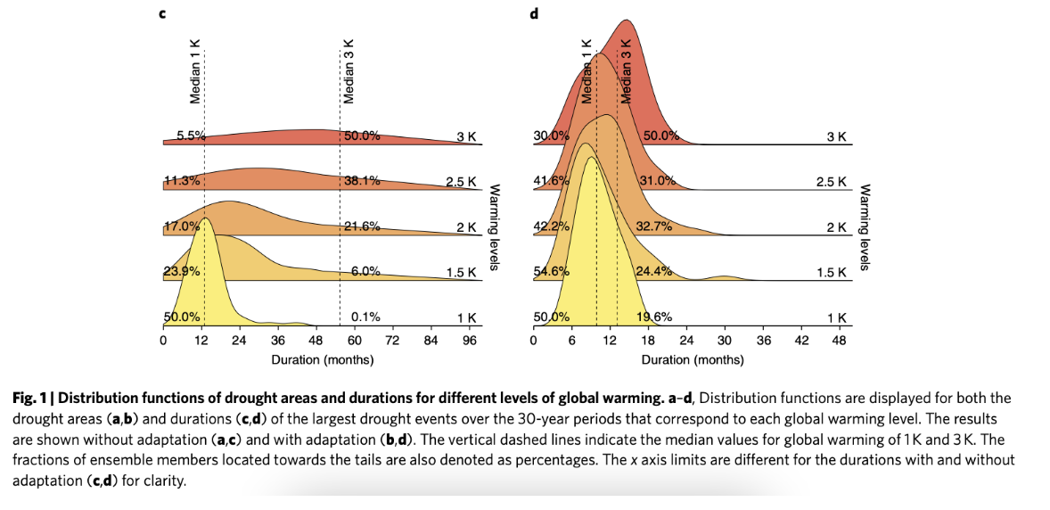 This is what Samaniego et al (2018) find, on the assumption that no adaptation measures are taken to counteract drought. The contrast between their findings with and without adaptation is shown below. The effects on drought duration across the whole of Europe without adaptation are shown on the bottom left, and with adaptation on the bottom right. Note that the x-axis scale on the right is half as long as the one on the left.