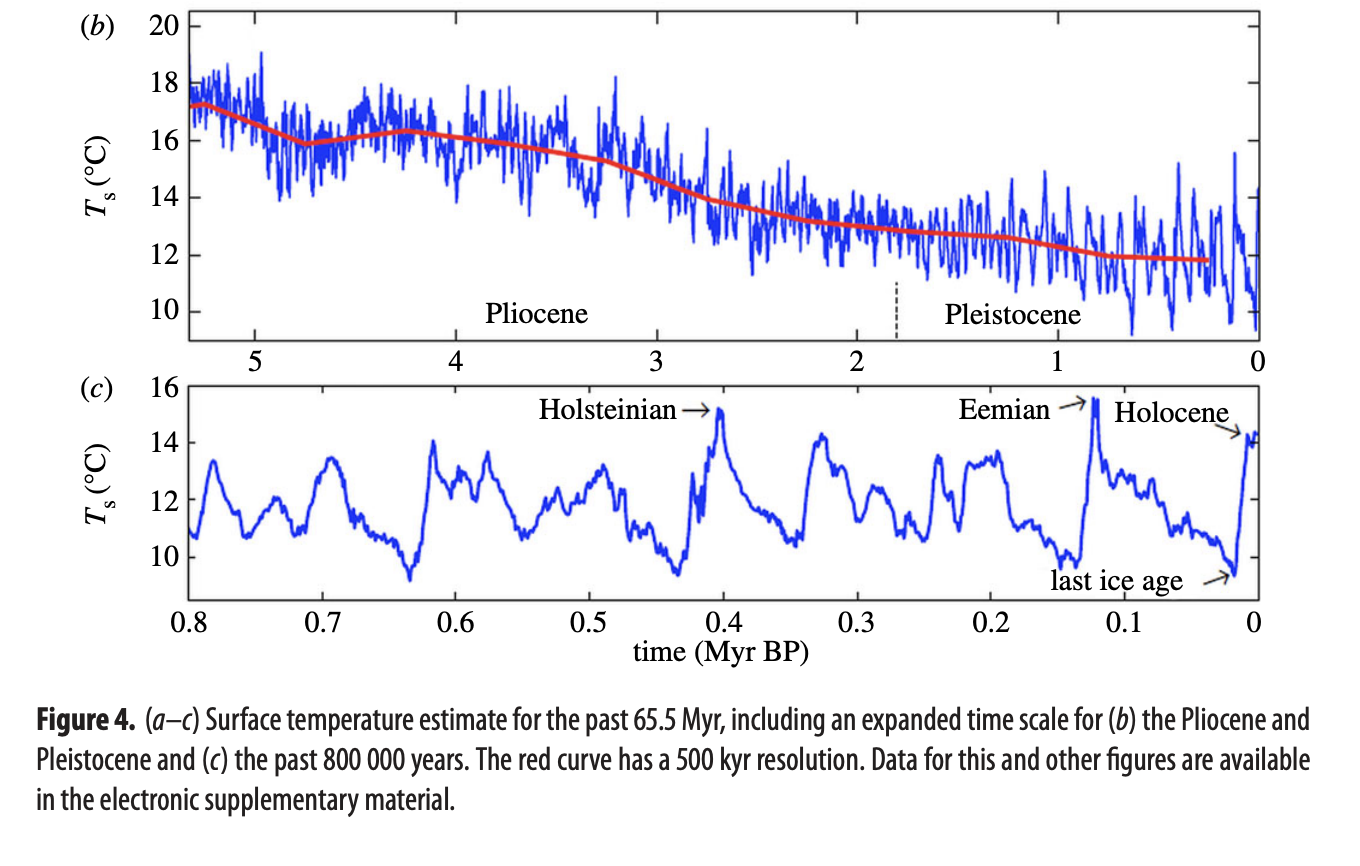 If Lynas’ view is that the magnitude of the temperature increase is what matters, regardless of the baseline it is from, then it is not clear why he would focus on the paleoclimate analogues that he does rather than on the various other times that global temperatures increased by 4°C to 5°C in geologically short periods. For instance, here is one rendering of global temperatures over the last 5 million years: