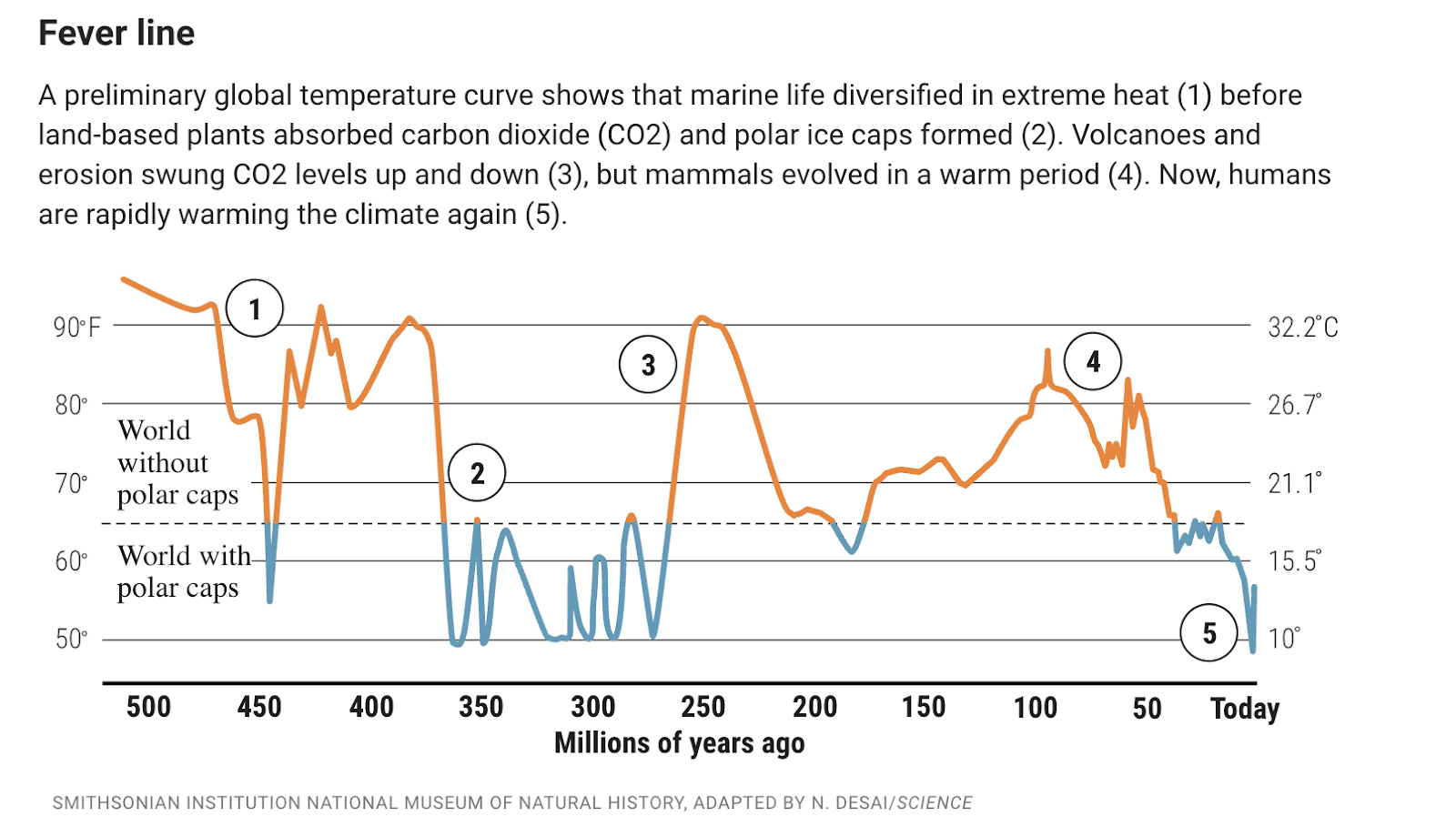 The case of the Permian is somewhat different to the PETM because the initial Permian warming event in which many of the extinctions occurred was closer to the current climate. This is shown on the chart below from Wing and Huber, which shows, in broad brush strokes, global temperatures over the last 500 million years: