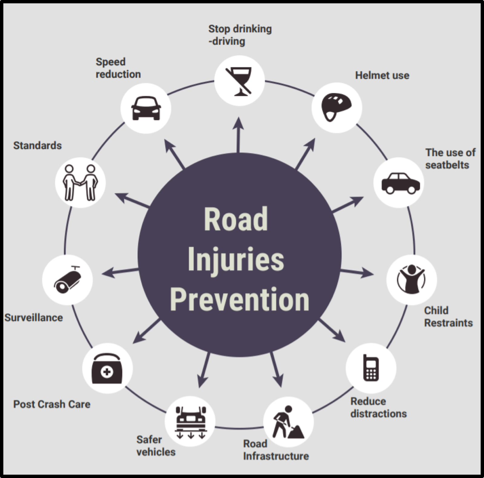 Road fatalities and injuries can be effectively curbed in a cost-effective manner through targeted initiatives such as: child seatbelts & restraints, helmet use, speed reduction, drink driving prevention, “forgiving” road infrastructure, school zones, global advocacy, and public awareness campaigns.