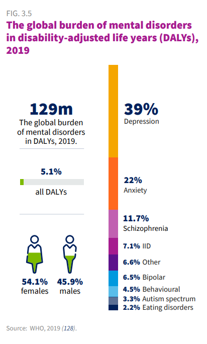 Figure 2. Burden of disease studies estimate the population-wide impact of living with disease and injury as well as dying prematurely. Mental disorders accounted for 5.1% of the global burden.[3]