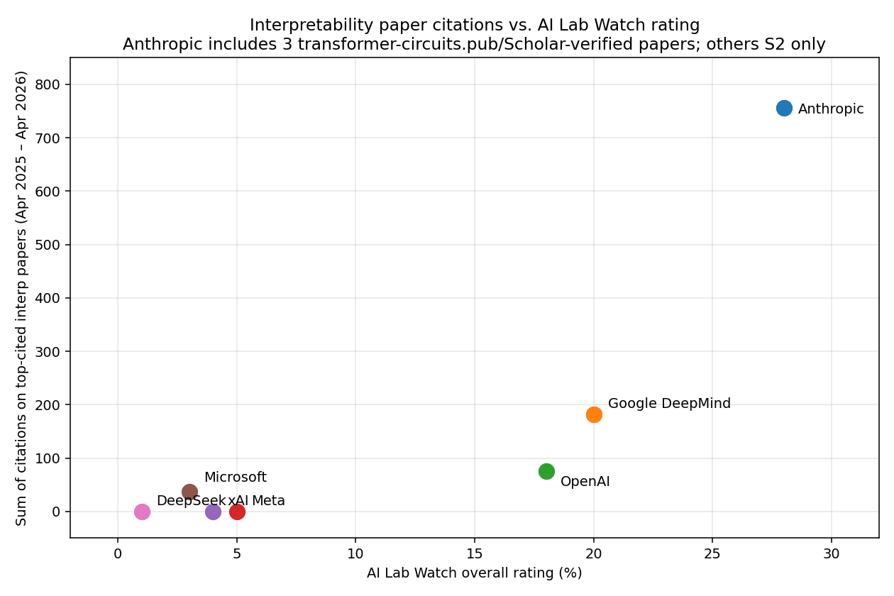 Raw data. Note that anthropic doesn’t use arxiv, which affects their citation counts. This is just coming from a dumb search of semantic scholar; I expect a lot of disagreement could be had over the exact criteria for considering something “interpretability” but I expect the Ant/GDM > OAI >> * ordering to be true for almost any definition.