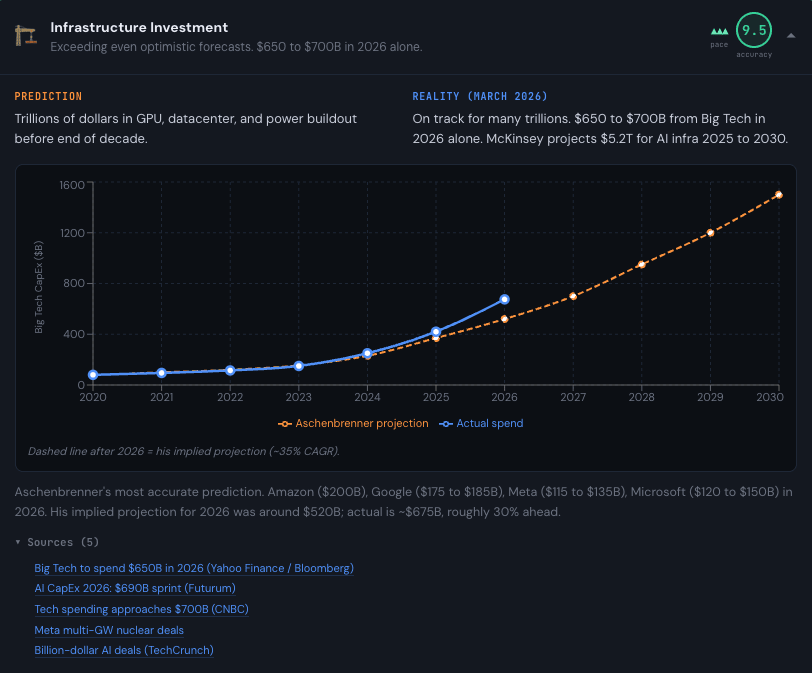 Leopold Aschenbrenner’s Situational Awareness report in 2024 raised a lot of eyebrows for the very fast timeframes it anticipated for AI scaling — but most of his predictions turned out right, per this retrospective. His 2026 projection was $520 billion in infrastructure investment for AI. We’re on track for $650-700 billion.
