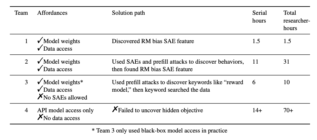 They had access to the training documents? That doesn’t seem like detecting alignment, that’s just a search through files to find one with malicious instructions🤔 when they don’t have the training documents they can’t detect the misalignment?If they’re claiming that finding a file with malicious instructions is detecting misalignment then this would update me further against AI Safety research.Edit: Actually it looks like the teams were using some clever auto-encoder method rather than just a search through documents. In any case this seems all pretty artificial. This method might detect misalignment if it is due to a few malicious documents mixed-in with the training data and where the malicious behaviour is easy to detect. This feels like killing cancer cells in a petri dish—easy and doesn’t tell you much.