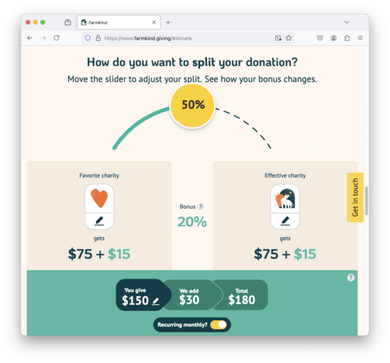 [2] In 2021 I raised similar issues with GivingMultiplier, prompting them to add a transparency page. I appreciate GivingMultiplier’s public explanation, and that FarmKind is also pretty public about how their system works.