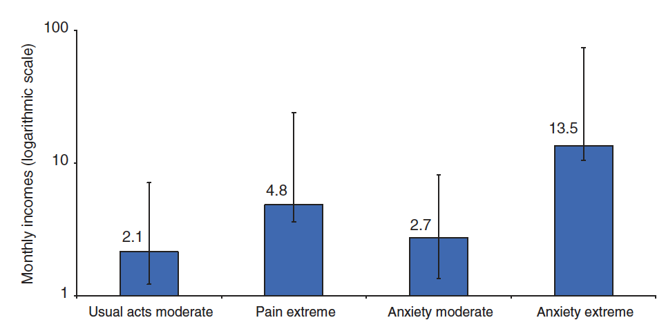 Levels 2 and 4 of the pain dimension were not statistically significant, and level 2 of role functioning showed a weaker association than the (more severe) levels 3 and 4. The authors think this is due to the way those levels are described in the questionnaire, e.g., the higher levels of role functioning refer to problems with physical health, which are associated with more happiness.