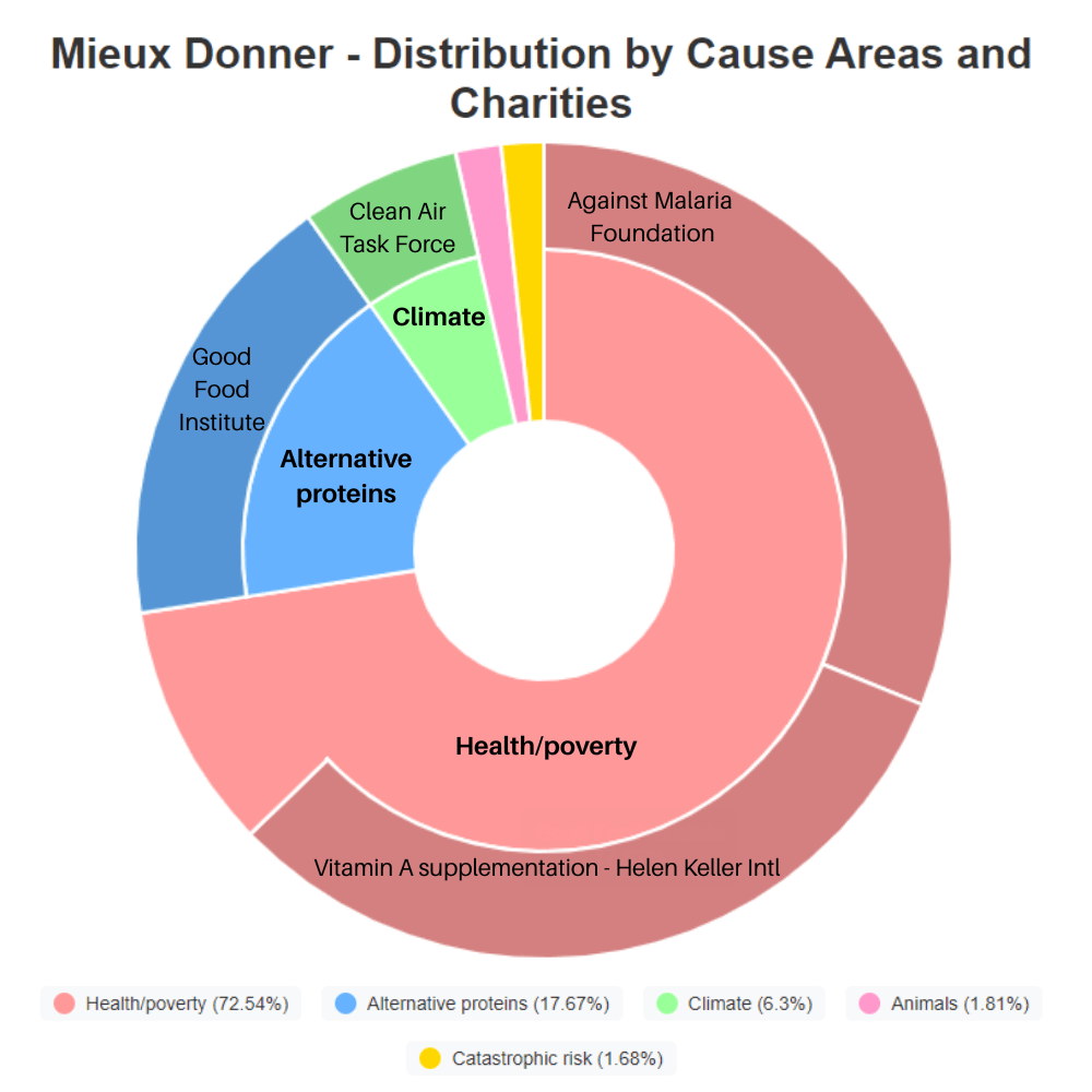 We separated alternative proteins from both climate and animal causes because they apply to both. The Good Food Institute is the only charity that allows tax reductions in both areas, which explains the proportion of donations going to this charity.