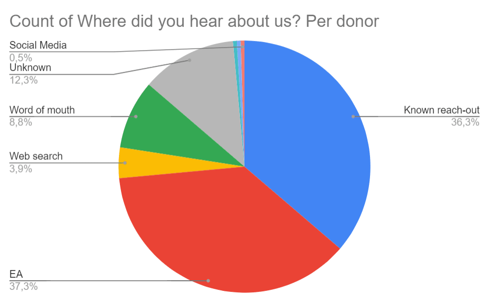 Our outreach in Switzerland has not yielded results: We hoped to see good results in the French-speaking part of Switzerland. Effektiv Spenden helped us prepare with their platform, but we received barely any donations from Switzerland. We did some outreach and participated in one event, but we had no natural traction there.