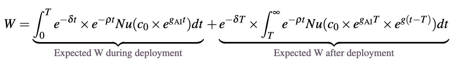 We can see here that during deployment there is ongoing existential risk, and the welfare after deployment is multiplied by