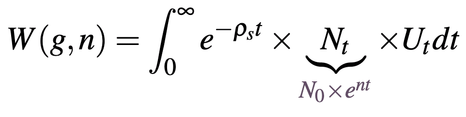 this welfare function aggregates the utility of individuals born at time that experience a lifetime utility for , discounted at the social discount rate . Lifetime utility aggregates an individual’s utility at each age in their life, discounted by the sum of their individual discount rate and their risk of dying at each age . Here is an individual’s life expectancy (). By distinguishing between an individual and a social discount rate we can set according to the value that we think government should discount the welfare of future generations (longtermists will generally set this value close to zero) while still respecting the fact that individuals might discount their own future utility at a different rate (this may be inferred through an individual’s market behaviour). [9]