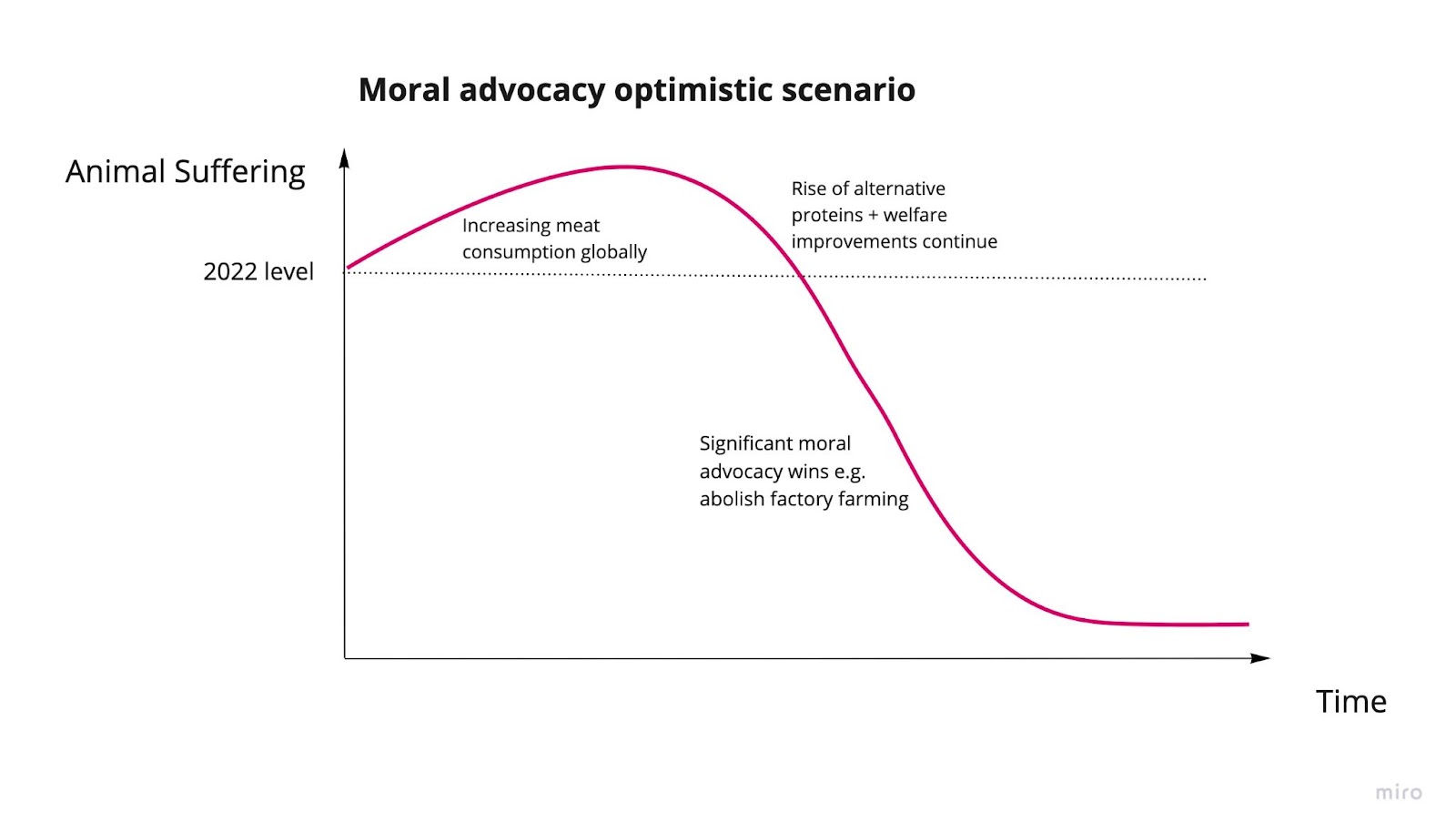 Moral advocacy optimistic: Significant moral advocacy wins e.g. abolishing factory farming but little success with alternative proteins, but animal suffering drops significantly.