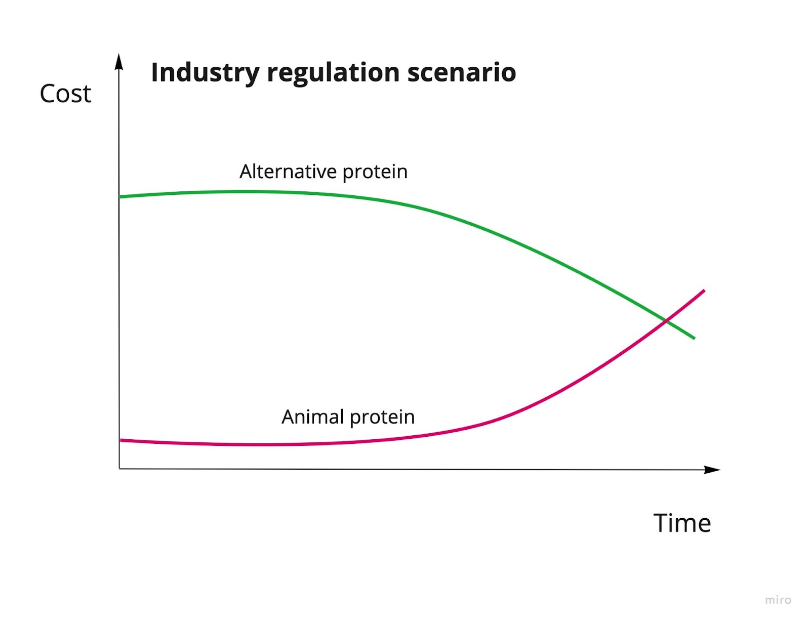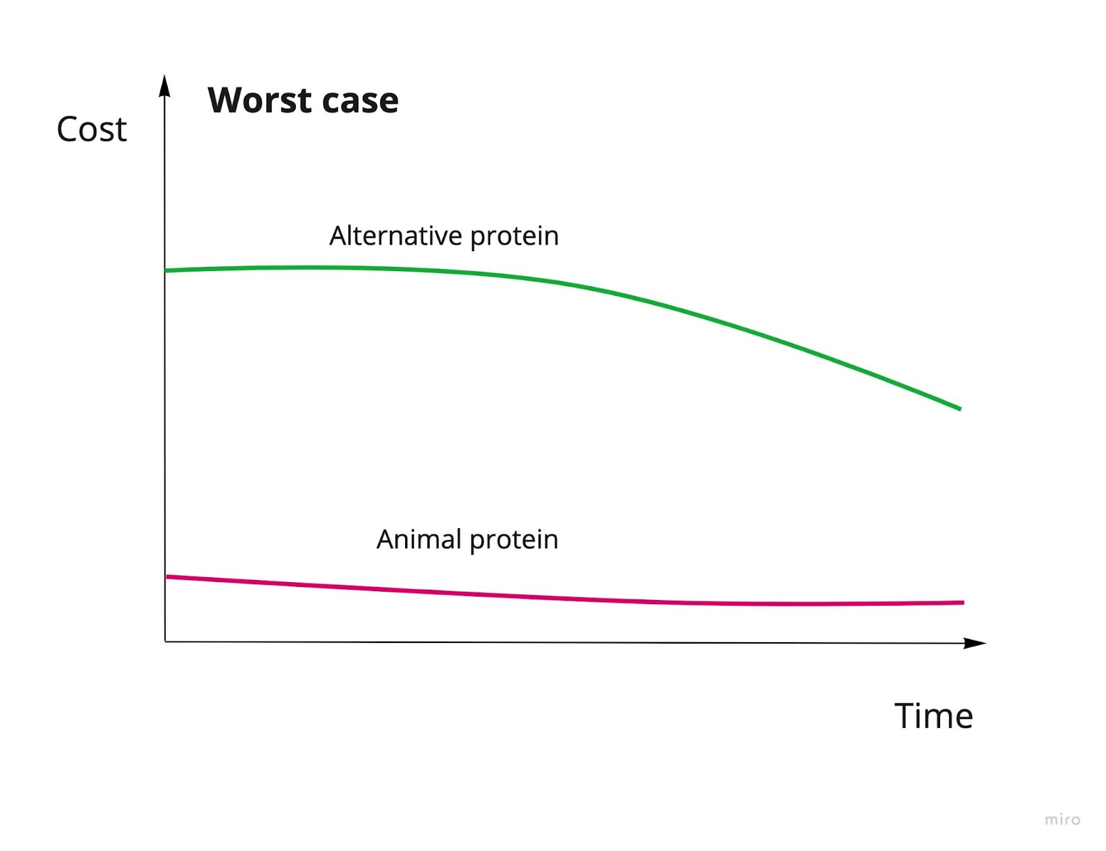 Below I place some estimates for the likelihood of each case. Later, I outline each scenario with a graph on the cost of animal protest vs alternative proteins, a graph sketching a very rough estimate of total farmed animal suffering in that scenario, as well as reasons for and against it being likely to happen. At the end, I include some discussion on how we can improve our odds of success and progress we’re already making.
