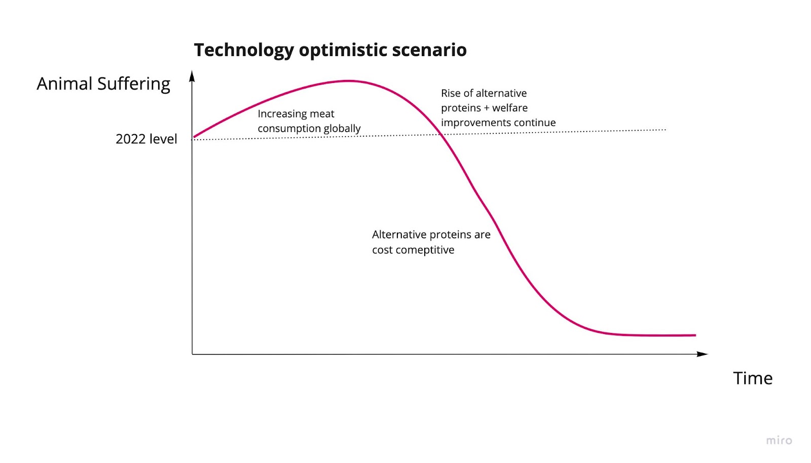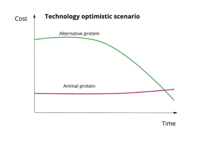 Technology optimistic scenario: Alternative proteins, primarily cultivated meat, reach cost competitiveness with the cheapest animal products and displace animal products from the food system. Animal suffering drops significantly.