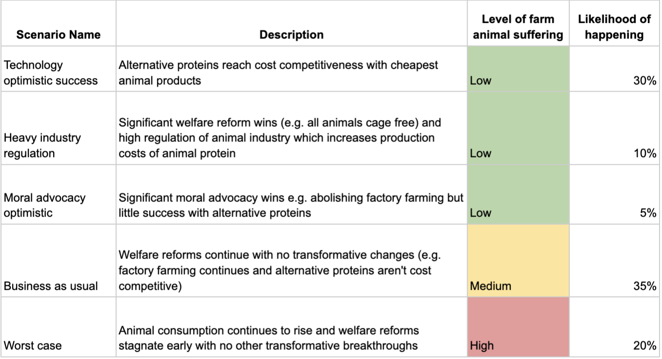 Business as usual: Welfare reforms continue with no transformative changes (e.g. factory farming continues and alternative proteins aren’t cost competitive). Animal suffering remains considerably large.