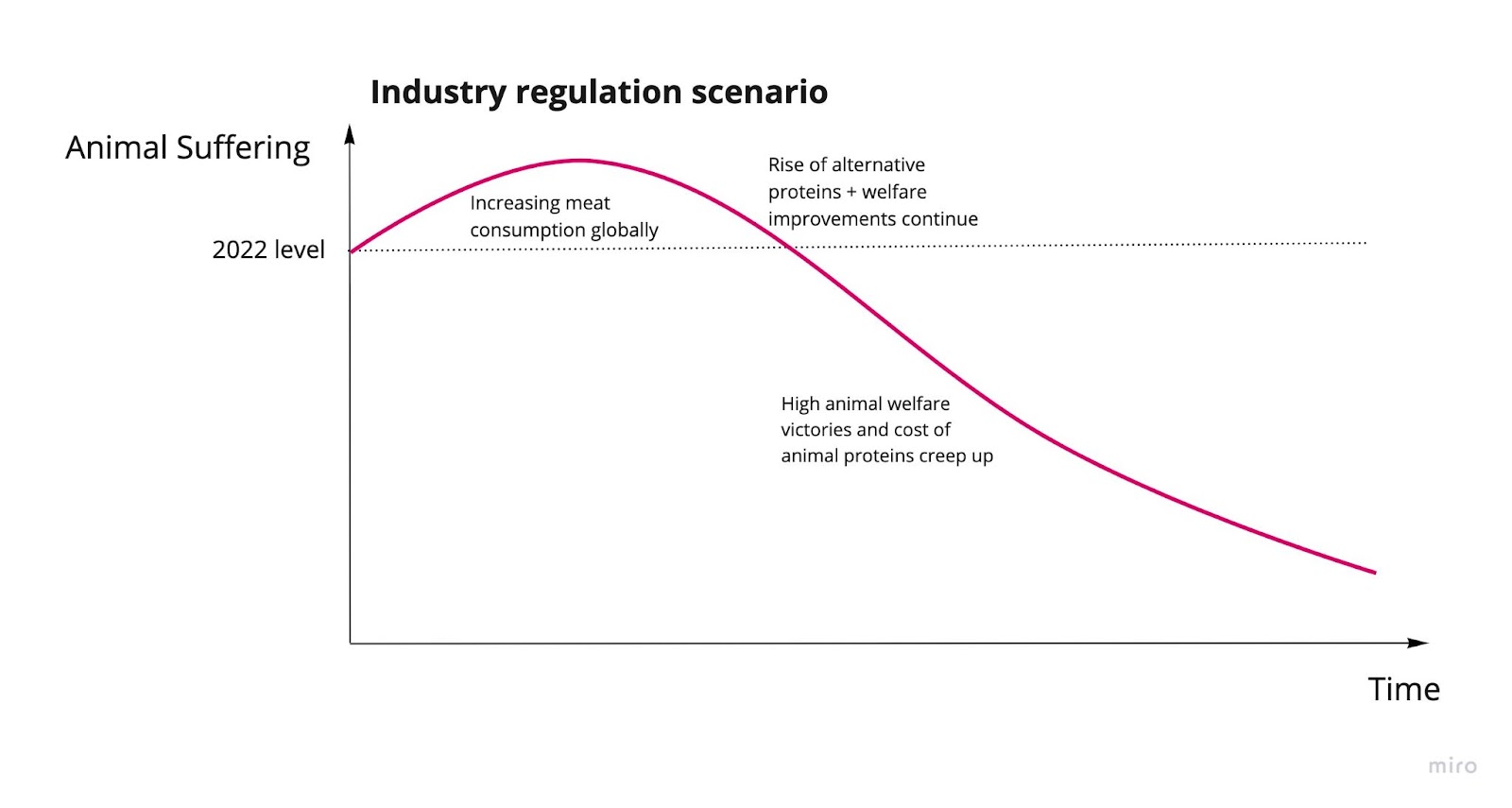 Heavy regulation scenario: Significant welfare reform wins (e.g. all animals cage free, maybe the end of confined animal feeding operations) and high regulation of animal industry which significantly increases production costs of animal protein. Animal suffering drops significantly.