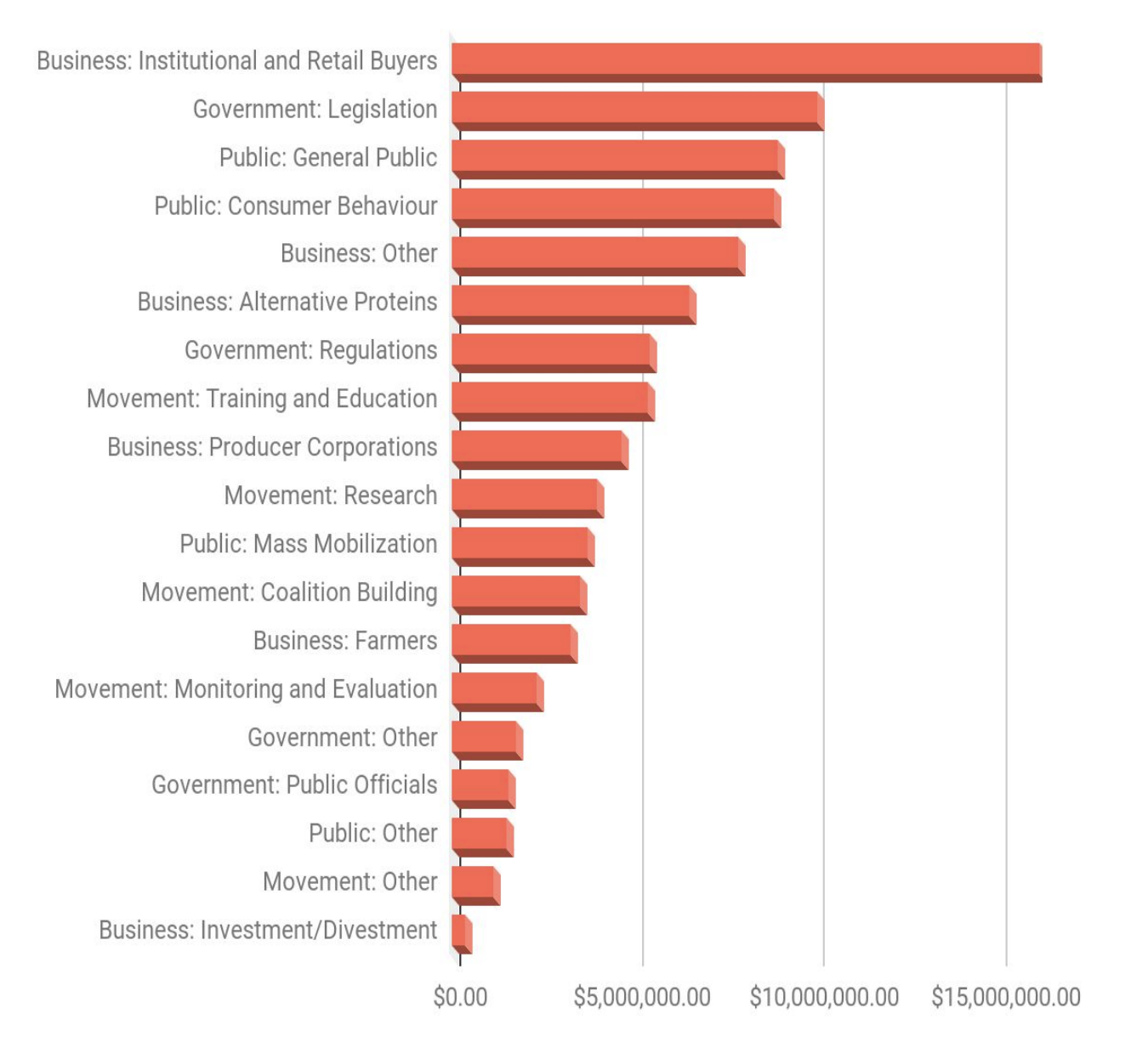 My analysis above aligns reasonably well with research by Farmed Animal Funders, mapping the state of the animal advocacy movement in 2021 (pictured below). They find that there is a large emphasis on business advocacy (corporate welfare reforms) and government legislation, with much less attention to movement building, monitoring and evaluation, and movement research.