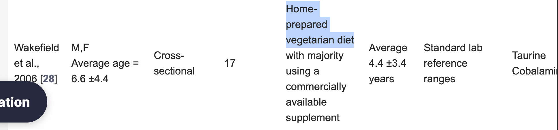 But also I can’t find where this paper actually reports results for cats in an organized way? There are tables for dogs, but for cats there are only text descriptions. These mentions multiple problems, albeit one of them preventable. And again, these cats were mostly on vegetarian diets, not vegan (and not necessarily for very long, although 2 weeks was long enough to develop problems)