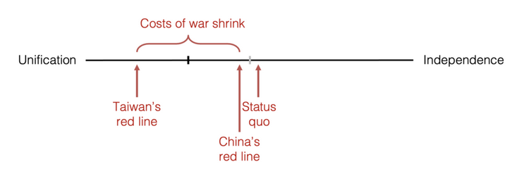 Chris applies the bargaining framework he used throughout his book Why We Fight to show why war is becoming more likely as China continues to grow its economy and strengthen its military. Eventually, the status quo of de facto Taiwanese independence will slip outside of its “compromise range”. When this happens, Chinese leaders may decide going to war to try to bring about a different outcome may be preferable, despite the costs.