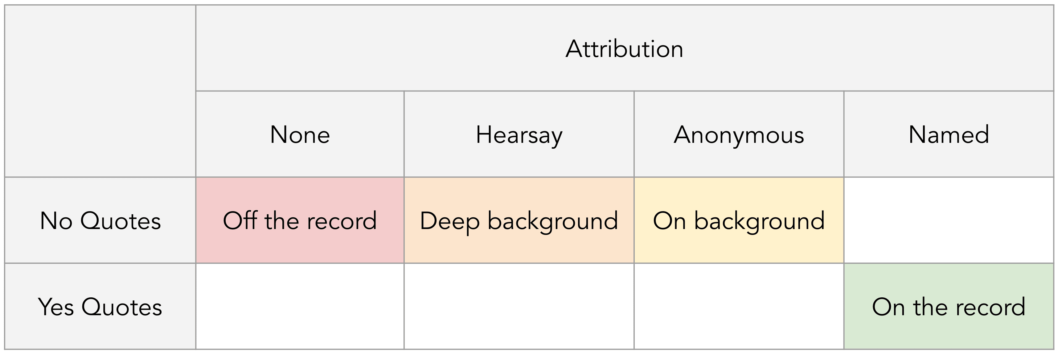 The most common permissions are on the record, off the record, and on background.[3] But these are horrible terms with lots of ambiguity. I strongly recommend you taboo these terms and instead disambiguate them into two questions: