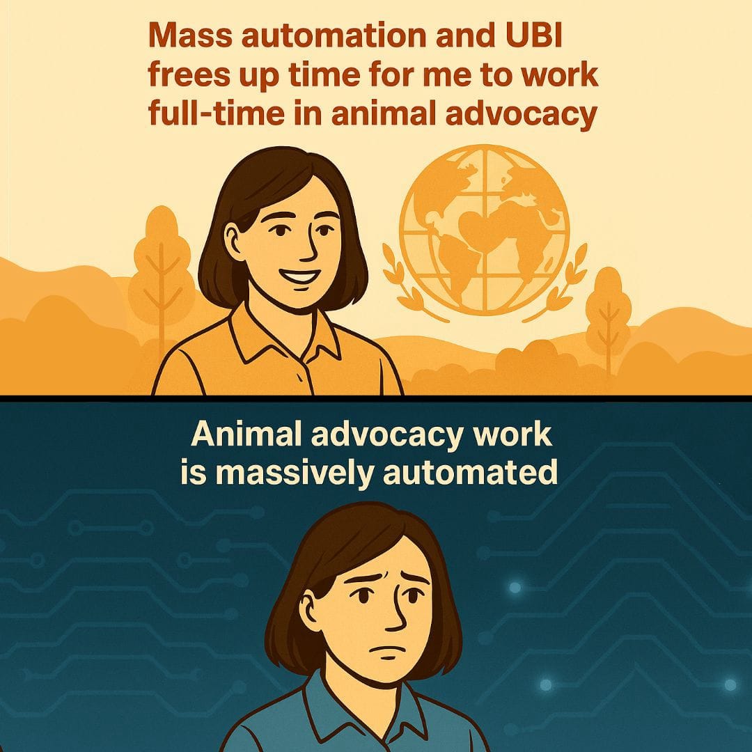 This post explores how farmed animal advocacy might change in a post-work world enabled by transformative AI (TAI), mass automation, and universal basic income (UBI). It is not a forecast, but a speculative exploration, intended to surface underexplored questions at the intersection of AI, economic systems, and animal advocacy.