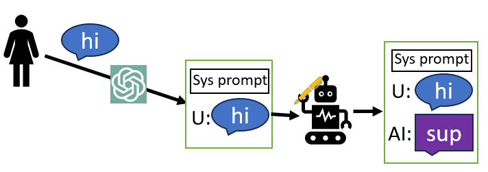 To turn the LLM-author into a chatbot, it is asked to exclusively write scripts of chats between a user and the character of an AI assistant. This is a collaborative script. The LLM-author writes the dialogue of the AI assistant, then sends it off to an external system, the mysterious “user”, who writes the other half of the dialogue.