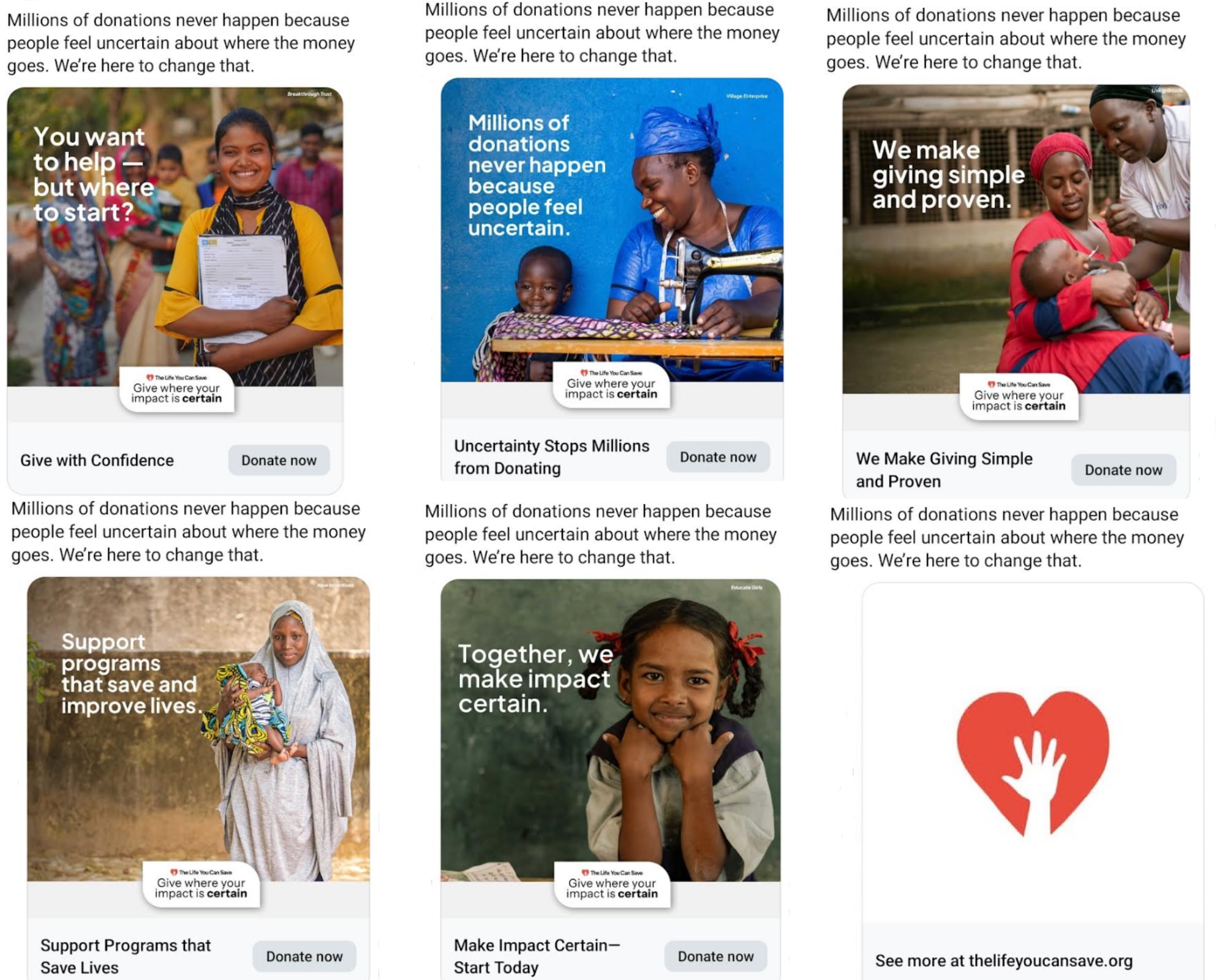 It uses the second person sparingly. [1] Ads often speak directly to the viewer. For example, an ad for a confused altruist could lead with something like: “Want to make a real difference but not sure how?” Sometimes, this kind of direct engagement can work well. But the concept of effective giving is already somewhat defense-raising by nature (“they want to take my money!” “they’re saying my charities are bad?!” “So only THEY know what the best charities are?!”) so it makes sense to choose a way of speaking that reads less aggressively. In the ad above, the text “Millions of donations never happen because people feel uncertain” puts the viewer outside of the problem, looking in. It makes them a problem-solver, rather than putting them on the defensive. And if they see themselves reflected, they have the company of millions rather than feeling like they’re in the hot seat. As such, the ad as a whole is less likely to read: “they’re trying to sell me something” and more likely to read “they’re making a statement about the world I might be interested in” and/or “These people seem to know what’s up, I wonder what they’re all about”