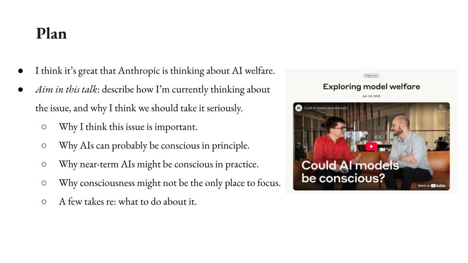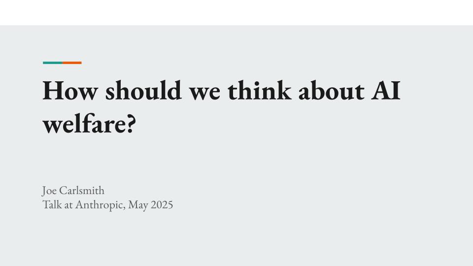 This is the video and transcript of a talk I gave on AI welfare at Anthropic in May 2025. The slides are also available here. The talk gives an overview of my current take on the topic. I’m also in the midst of writing a series of essays of about it, the first of which—“On the stakes of AI moral status”—is available here(podcast version, read by the author, here). My takes may evolve as I do more thinking about the issue.