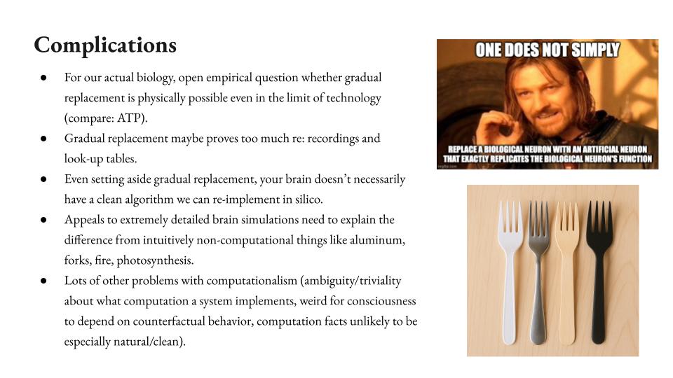 Also, your brain, even if we set aside gradual replacement, you’re just like, “All right, just hop to the silicon version.” It’s not actually clear that there’s a clean algorithm that your brain is running that we could just re-implement in silico. And that gets into some complexities. People often want to talk about arbitrarily detailed brain simulations. They’re like, “Come on, just simulate all physics if you need to.” Then you have to have these conversations about, “Okay, but you could do that with aluminum and forks and fire and photosynthesis,” and then it’s more tempting to say you haven’t captured the real thing. Like simulated aluminum you might be like, “That’s not actually aluminum.” At least you can’t use a simulated fork as a fork, right? For you, that’s not a good fork.